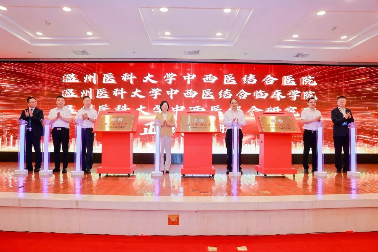 (王彩莲、吕一军、李校堃、董宇、王晓春,温州市中西医结合医院党委书记朱文宗、院长姜文兵共同见证揭牌仪式)