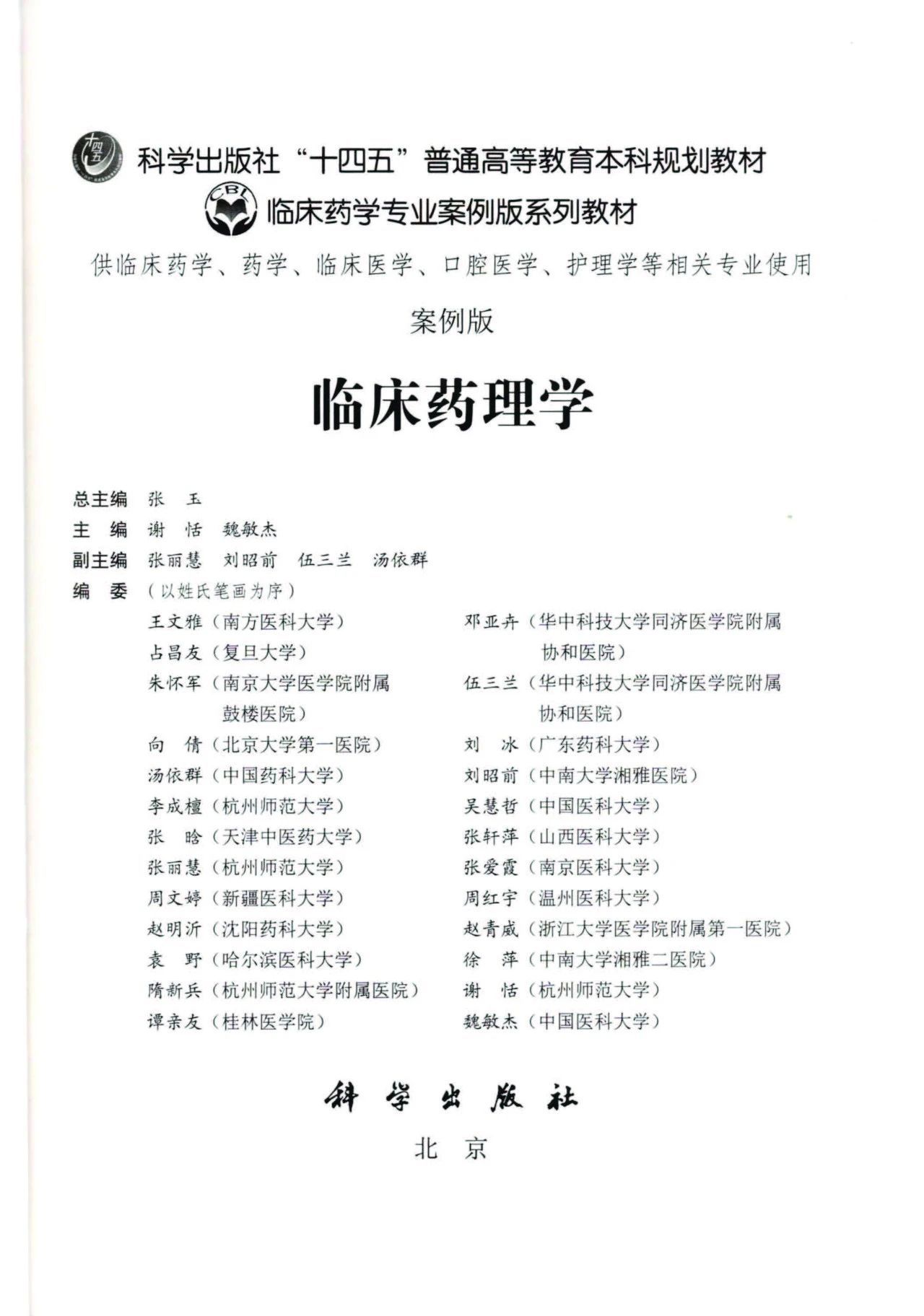• 中国医学科学院学部委员、杭州师范大学药学院谢恬教授作为第一主编的《临床药理学》(案例版),近日由科学出版社出版发行。该教材入选科学出版社“十四五”普通高等教育规划教材,由全国23所高校的26位一线药理学和临床药理学专家学者参加编写,供临床药学、药学、中药学、临床医学、口腔医学、护理学、中西医结合、中医学等专业的本科生与研究生使用。